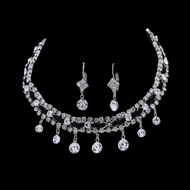 This stunning necklace and earring set features a cluster of Swarovski Jet crystals in the middle of the chain and paved with Black Diamond crystals in two rows, joint by solid gold metal. Metal is plated with 14K Gold or Rhodium, which is a precious metal that will not tarnish easily and will give the wearer a longer enjoyment of the piece. One chunky Jet crystals and two giant Black Diamond crystals plus four medium ones are designed as pendants. A Black fine leather cord is stung in the middle of the chain. This necklace and earring set will give the wearer elegance and glamour as diamonds at a more affordable price. Very secure closure with a lobster clasp and can be worn as a set or as separate pieces. Extra chain is available for adjustable size. The drop earrings will fit snugly with the pierced ears and a hook back closure will secure the earrings from falling off. This gorgeous design makes it ideal for formal occasions or parties, and also a glamorous gift.
