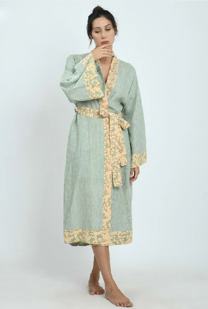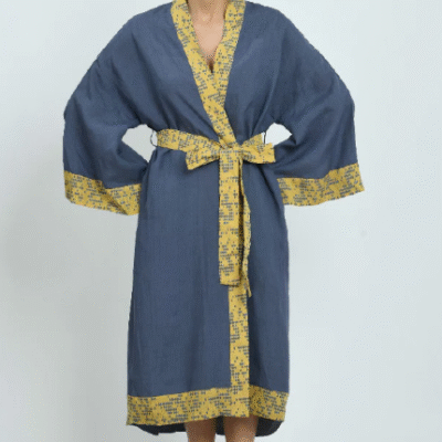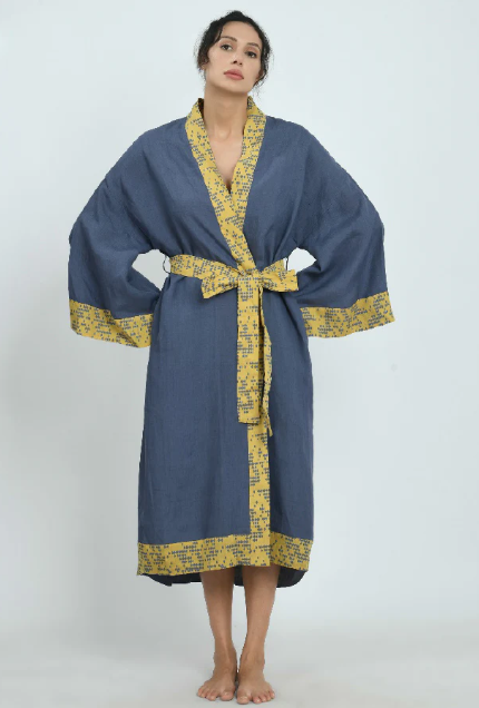 The full length and wide sleeves of this kimono are beautifully defined by the block printed edging in contrasting colours. Wrap up in it for a lazy Sunday morning then take it out to the beach for a light layer to save your skin in the sun.