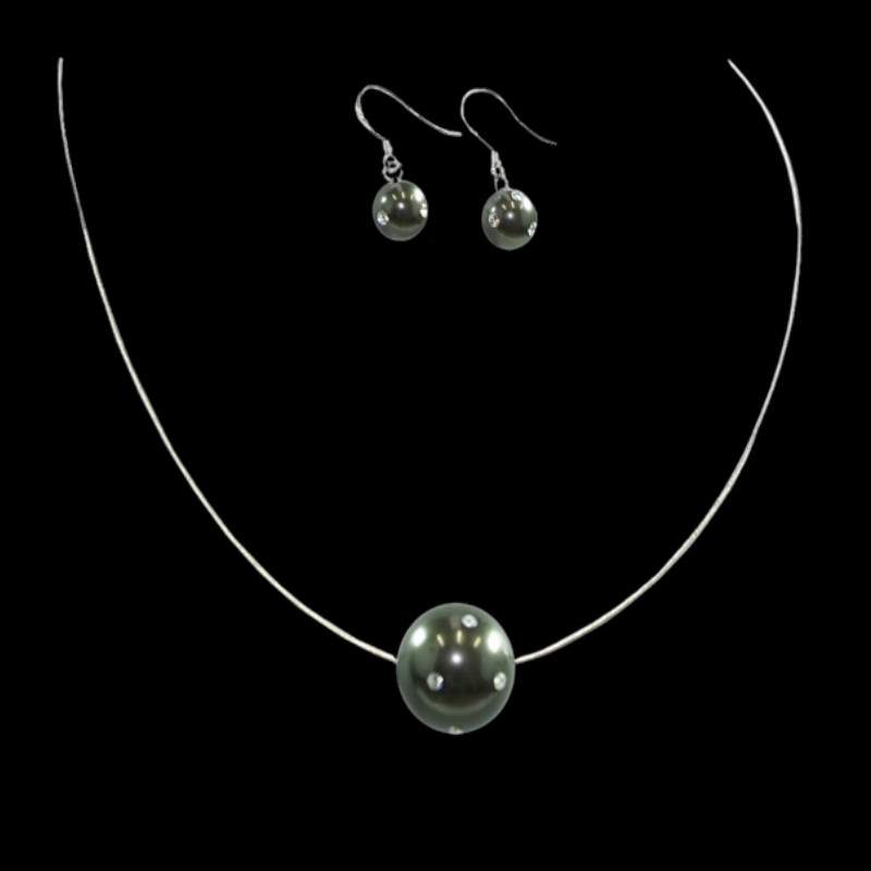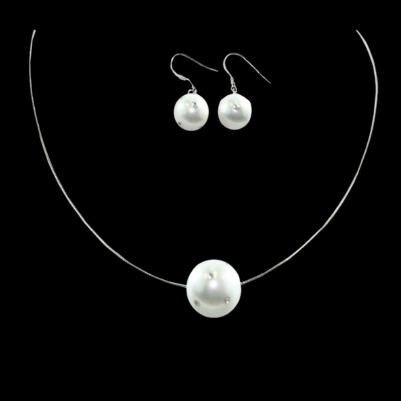 Necklace and Earrings are made of Mother of Pearl, engraved with Cubic Zirconia stones. Both necklace wire and earring hooks are made of 925 Sterling Silver with white gold double plating. Exclusive Australia Design, Exclusive to Essential Import & Export only.